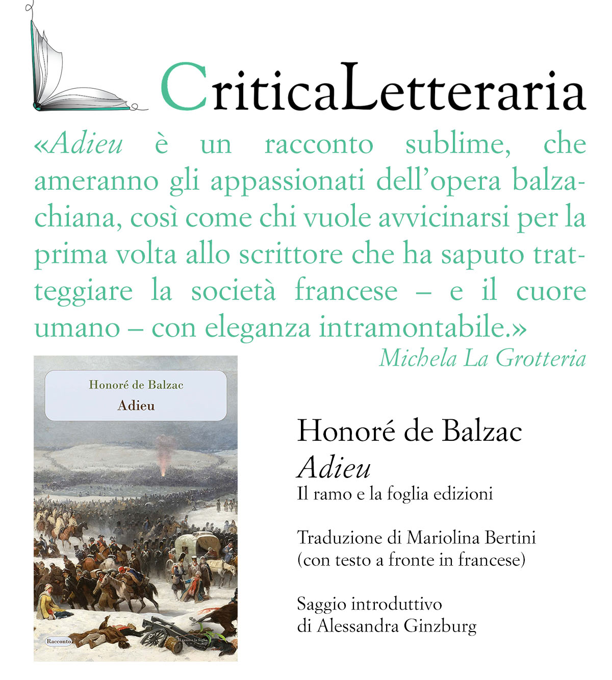 «Un “racconto in cui si fondono tanti generi, dal romanzo realistico alla fiaba, dalla narrazione di storia militare alla descrizione di un caso di alienazione mentale” (p. 5): così Alessandra Ginzburg introduce Adieu di Honoré de Balzac, nel suo...