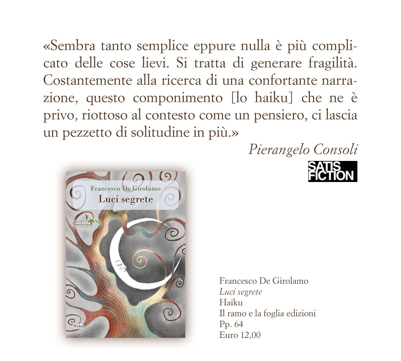 Ringraziamo Pierangelo Consoli e Satisfiction per la recensione a “Luci segrete”, la nuova raccolta di haiku di Francesco De Girolamo: